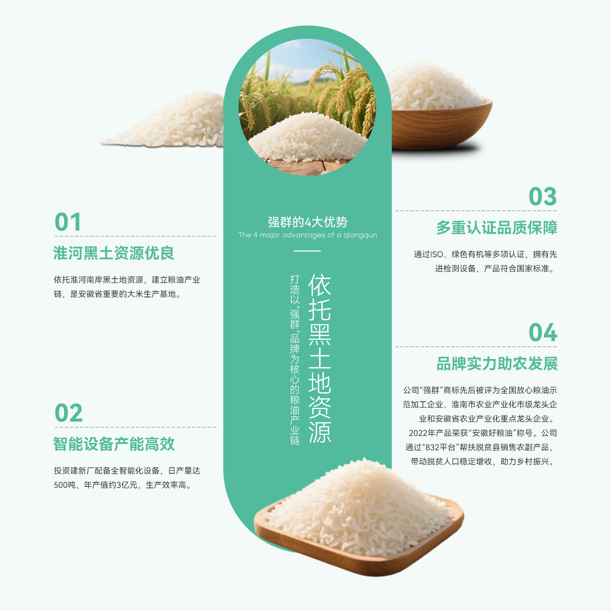 - 壽縣強群糧油貿易有限公司成立于2011年,座落在淮南市壽縣澗溝鎮,是一家集種植、加工、收儲、銷售于一體、以生產中、高檔質優(yōu)、特色類大米為主的綜合性企業。公司依托準河南岸的黑土地資源,打造以“強群”品牌為核心的糧油產業鏈,是安徽省重要的大米生產基地。 為響應市場增長需求,公司2021年啟動二期擴產工程,其中新生產廠區建設投入資金近億元,建設現代化新生產線,總占地面積約4000...